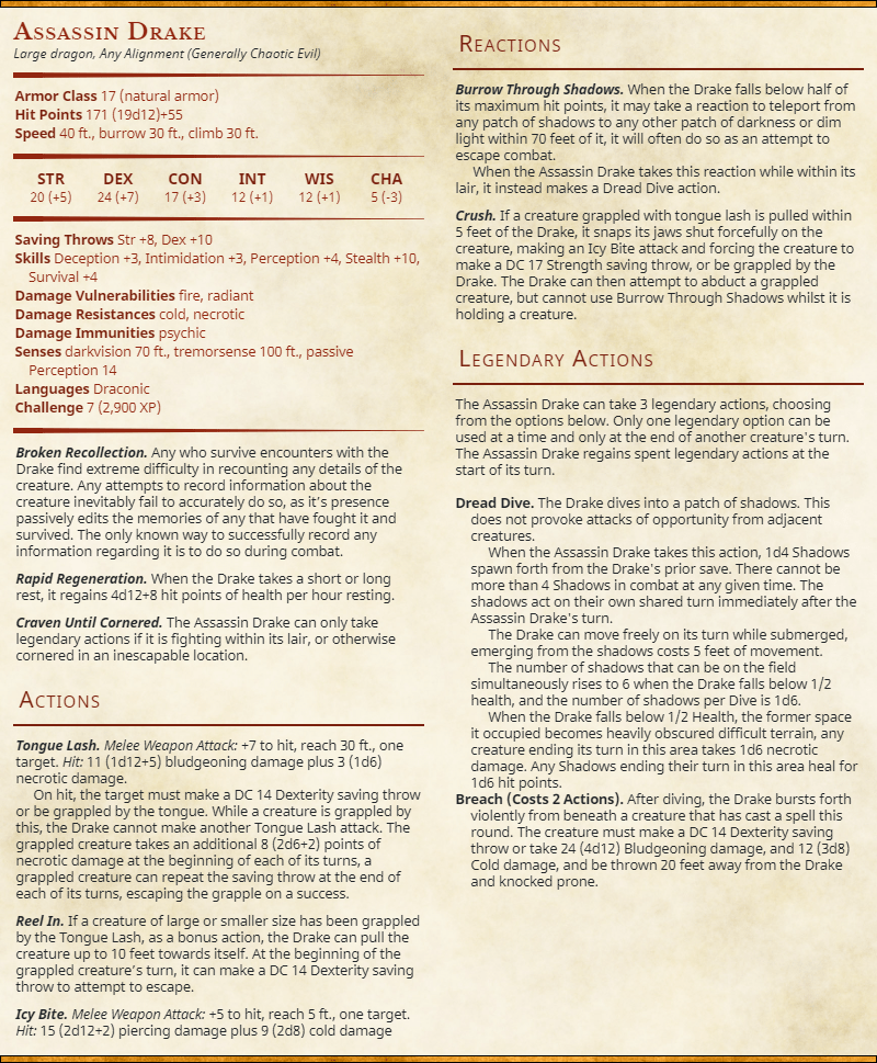 Alright, so I’m starting off with a big one here. This is one of my favorite monsters to run for a short campaign, or for an arc in a longer one. In designing the Assassin Drake, I actually worked alongside one of my regular players, and took considerable inspiration from memory-editing monsters like the infamous False Hydra. That said, whilst the False Hydra is a much more narrative-heavy monster, this one is much more combat oriented in its memory-altering abilities. The core concept is for an ambush hunter that edits the players’ memories of what it is after escaping from combat.