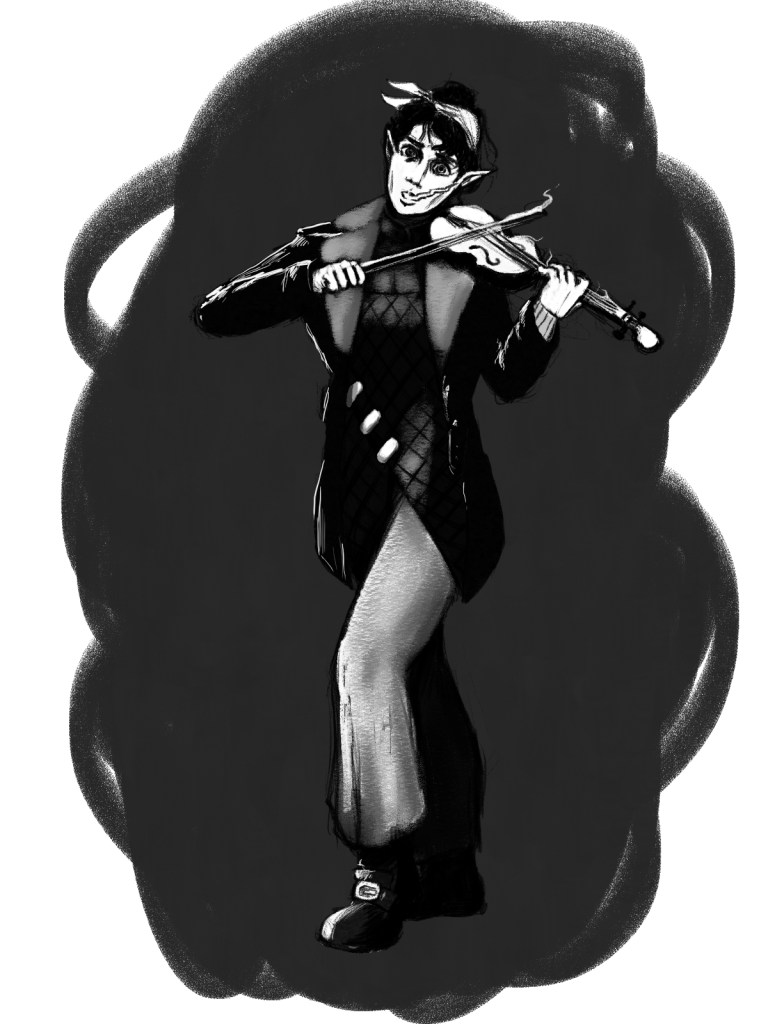 “As the gaunt half-elf woman wanders through the foggy night, her feet move silently in arrhythmic and unsettling patterns, and the only sound that fills the area is the discordant and chaotic hiss and shriek of her violin. Her bloodshot, wide eyes dart around as she takes in here surroundings, the lights of her home town visible ahead. They had called her mad, claimed her music was flawed and unsettling, but she would show them, now that she had her adoring admirers dancing around her they would see their error. The foul stench of death filled the air as rotting zombies and putrid ghouls moved around her, their bodies swaying and jittering like reeds in a terrible storm, moving with each pull of her bow across the strings. Soon, this vile host is upon the town, and the a chorus of shrieks and cries joins her maddening tempo.”